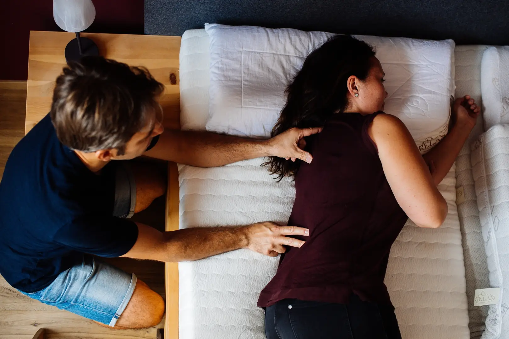 Im Liegen ertasten wir die natürliche Krümmung Ihrer Wirbelsäule und erkennen Druck- oder Hohlstellen.